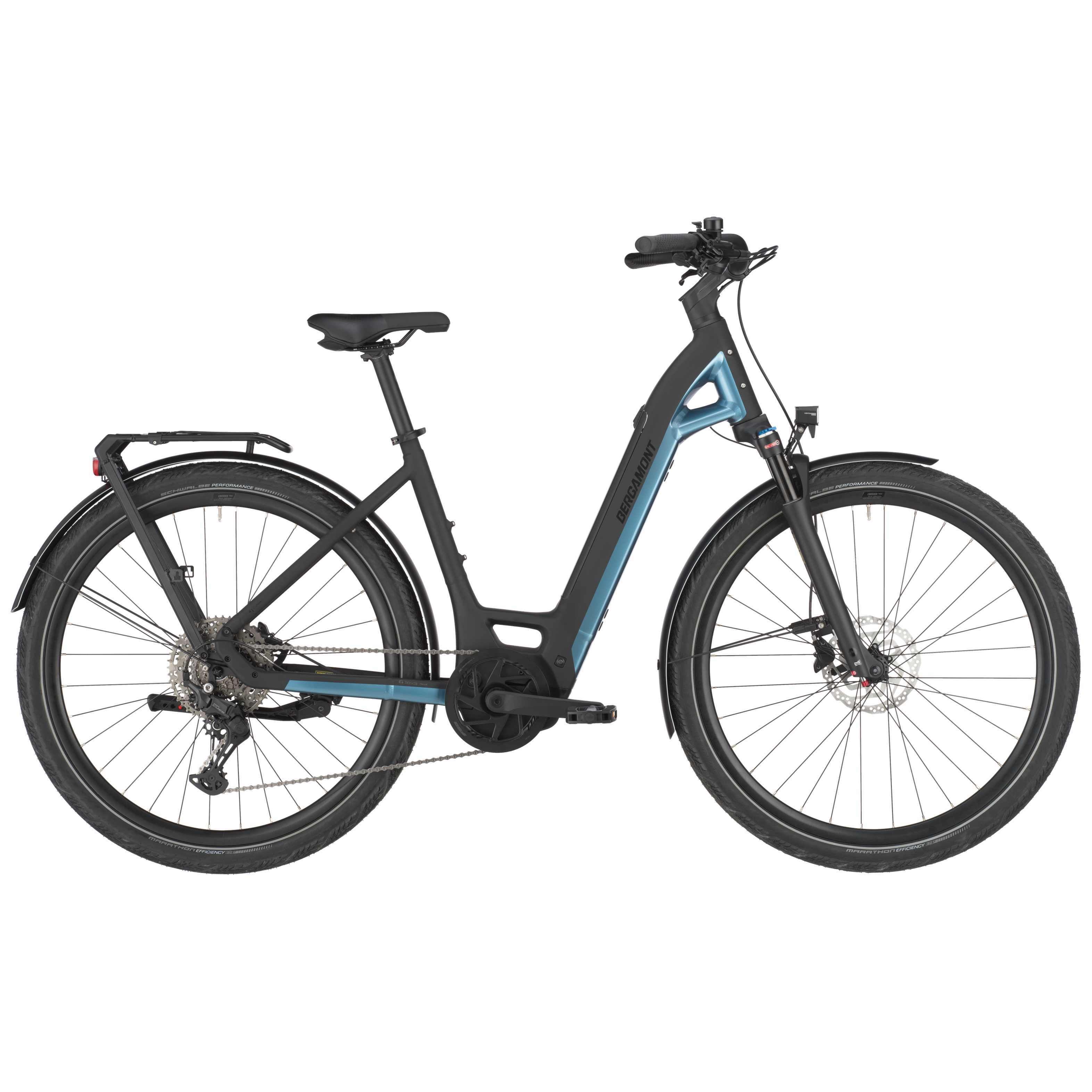 The Bergamont E-Ville is a lightweight urban bike with a low step-over height and a compact yet powerful Bosch Performance Line SX electric drive system. It’s the perfect companion to get around town for all ages and genders. The E-Ville model range features superior riding characteristics thanks to modern manufacturing processes like an investment casting of the central flange for best possible rigidity to weight ratio and perfect component integration. This core piece of technology also doubles as a handle if you need to carry your E-Ville. The Bosch CompactTube battery integrated into the frame can be easily removed for remote charging. With the Bosch Smart System advanced connectivity features and upgrades are available: use the eBike Flow App to control your bike or add optional extras like a Bosch PowerMore battery for increased range or a Bosch ConnectModule for GPS tracking. Lightweight aluminum frame with low step-over height, Suntour suspension fork with 75 mm travel, Shimano Cues 1×10-speed drivetrain, Bosch Smart System with compact Performance Line SX motor, Shimano hydraulic disc brakes, 28″ Schwalbe Marathon Efficiency tires, LED lighting system front and rear with brake light function.